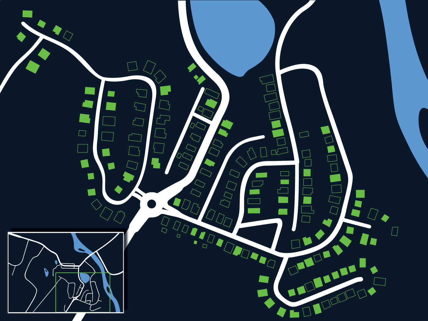 While it didn't make the final article, I created this map to show the number of homes that had been sold in McAdenville Village, a real estate development created in part because of the town's Christmas spectacle.