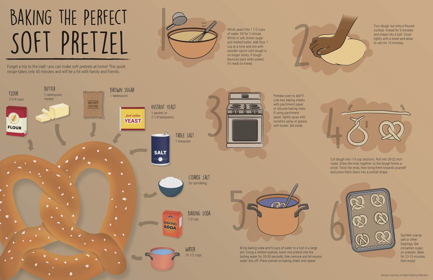 Want to impress your friends next time you have a party? Bake some soft pretzels—it really isn’t as difficult as it sounds. This infographic, adapted from a Sally’s Baking Addiction recipe, will show you how to get it done.
