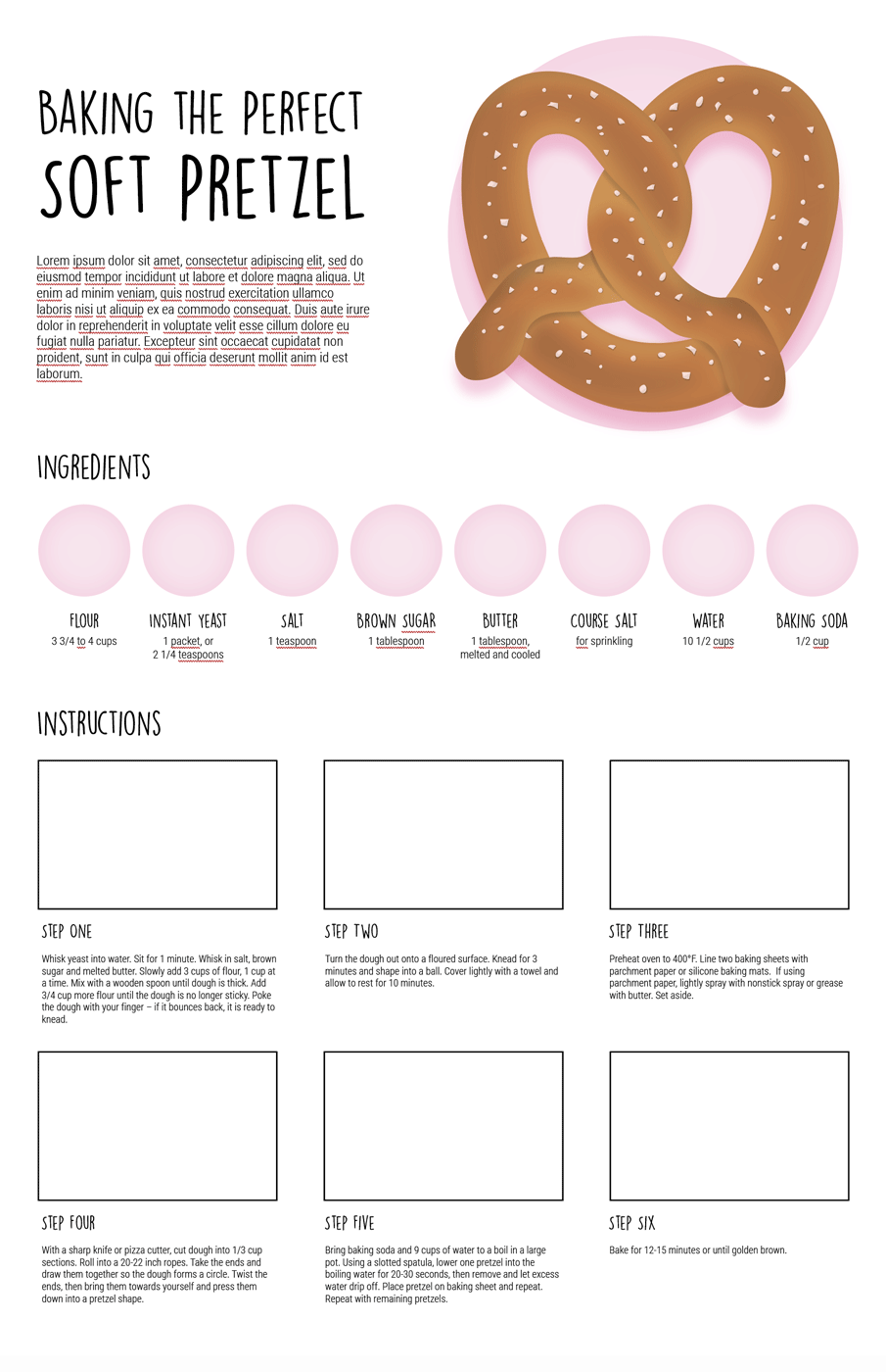 This project gave me an important experience: creating a step-by-step visual guide using detailed artwork. While I had created visual guides before, this was the first that really tested my illustration skills. On top of that, the project gave me the chance to bake some pretzels—you know, for research purposes.