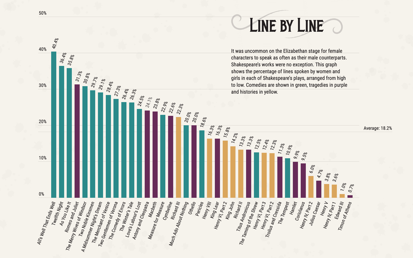 The infographic depicts the percentage of lines spoken by women or girls in each Shakespeare play. Comedies (green) frequently gave women more stage time than tragedies (purple) or histories (yellow).