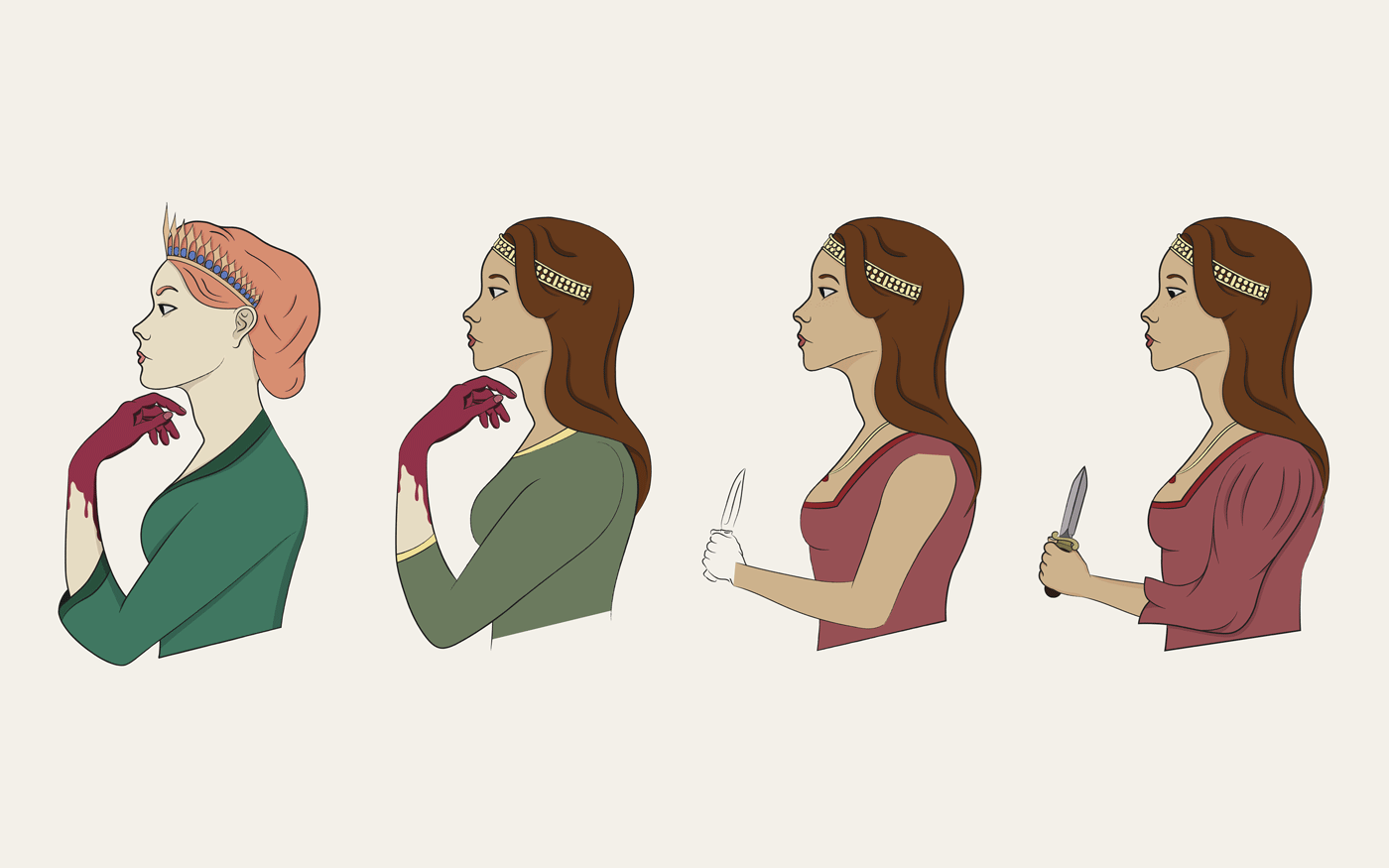 To create new characters, I reused Lady Macbeth's Silhouette and created variations in clothing, hair, body postion, and colors.