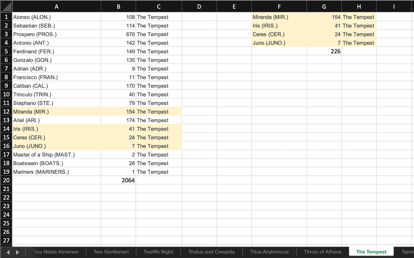 To determine these percentages, I organized information about the number of lines each character speaks in each play. In The Tempest, women speak 226 of a total 2064 lines.