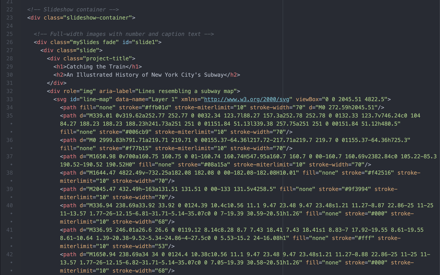Once I had my assets ready, I began to code using a combination of HTML, CSS, and JavaScript. To create a sense of authenticity, I designed the site with the colors and font (Helvetica) used on subway signage. This project was also the first time that I ever used JQuery, which allowed me to incorporate tooltips and a draw-on effect for my illustrations.