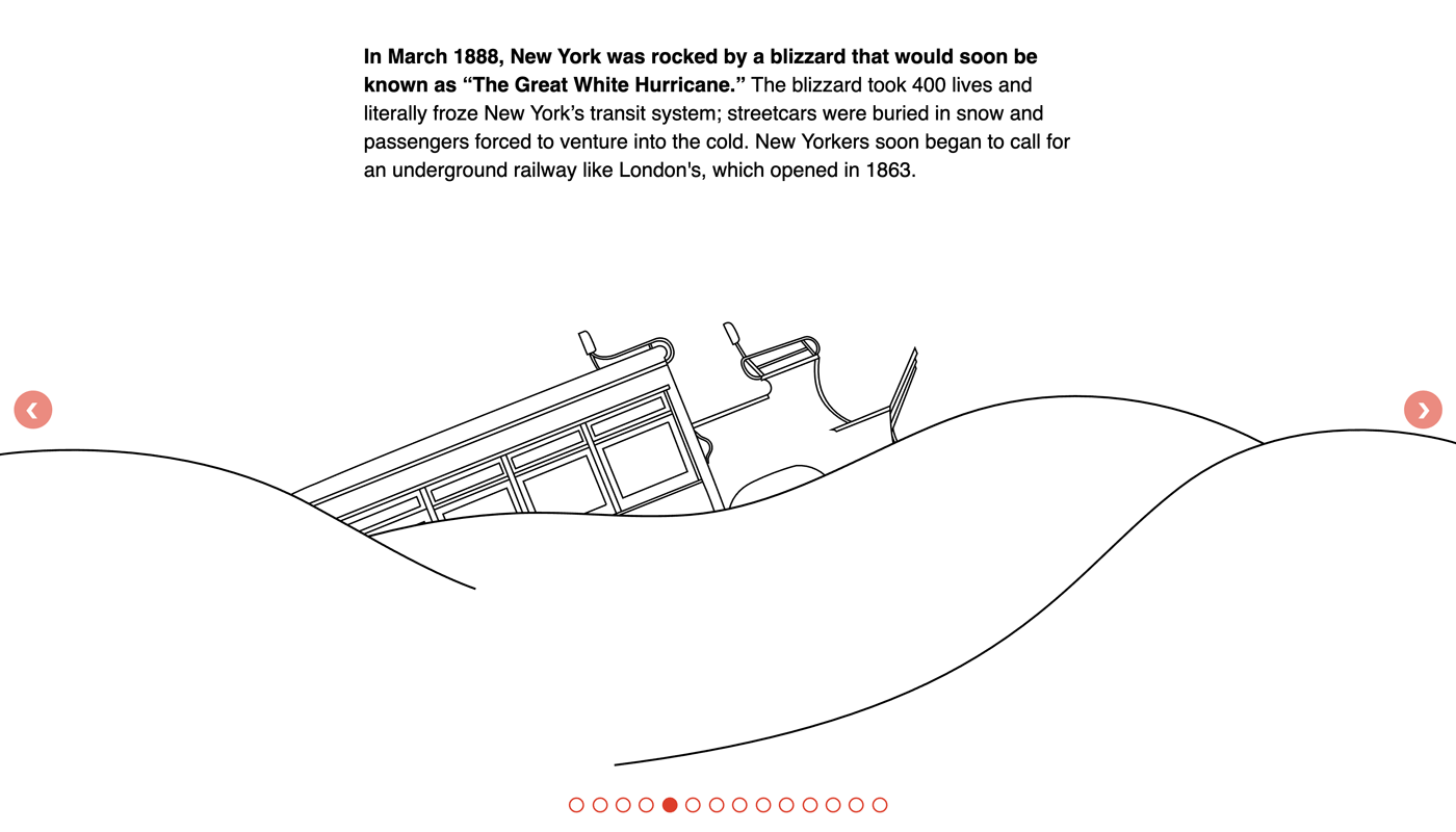 Creating visual history projects can be tricky. Sometimes there aren’t any photos of a particular time or place; other times there are photos, but they aren’t available for free use. So the best solution, I decided, was to create my own illustrations. After researching and writing a script for the slider, I created simple line drawings in Adobe Illustrator that reflected the story of subway.