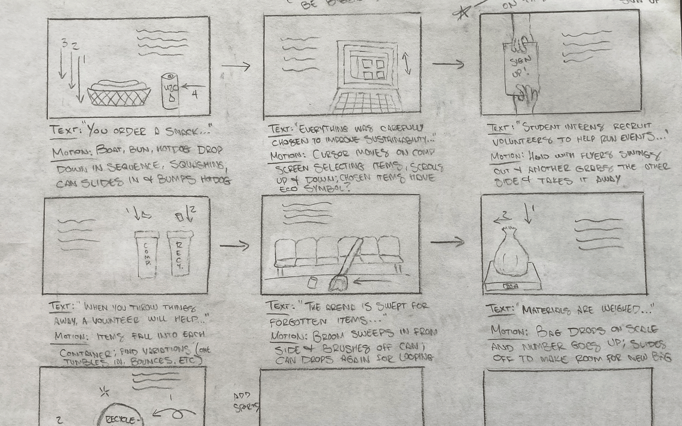 After learning how zero-waste games work from the staff who maintain this initiative, I began storyboarding visuals from the process that would interest an audience. After deciding on a set of scenes with a writer (who created the copy in this piece), I began illustrating, working in an outline style that matched the existing art style at Loyola and referenced the university’s colors. I then took to animating, creating gifs that could loop continuously on the story page.